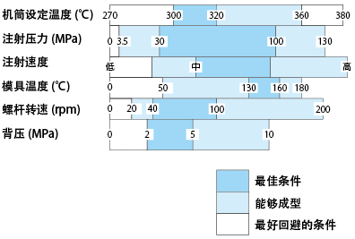FORTRON的成型条件范围如图2-1所示。为了减少飞边,应调高机筒温度并降低注射压力。