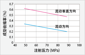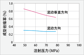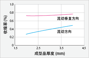 图3给出了FORTRON 1140A1和6165A4的成型收缩率。通过点浇口进行平板成型时的成型收缩率是侧浇口的流动方向和垂直方向的成型收缩率的平均值。 |