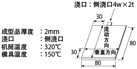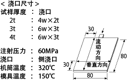 :80×80×2mmt平板 :侧浇口(浇口尺寸4w×2t) :320℃ :60MPa :150℃(6565A6和6565A7则为100℃) |