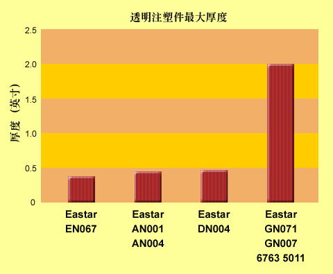 PCTG共聚聚酯的结晶速度较慢,可设计成相对较厚的透明产品。GN系列共聚聚酯不会产生结晶现象,所以在透明度上是没有厚度限制的。但是,考虑到灌水、气泡和流纹等注塑缺陷,我们建议其最大厚度为1英寸。
